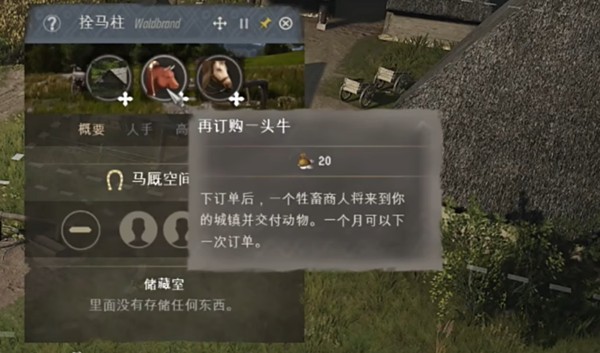 前期有50地方货币(和君主金币不是同一个物品,下文简称货币),其实在升级菜园之前,50货币最重要的用途是拿去买牛,一头牛20,牛是前期运送木头的必备牲畜,牛越多,运送木头的效率越高,建造建筑的效率越高,在技能点把重犁点出来之前,还有像锯木厂(生产木板)这种地方也可以绑定一头牛工作,这样前期木板产量才跟得上,不然修房子的村民要和锯木厂的村民抢牛用。可以选择前期补一个栓牛桩,然后把这个和开局送的那个都升级成小马棚,这样就能养4头牛,效率就起来了。