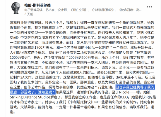在领英个人页面上,这位制作人近日发文探讨了自己在游戏行业的未来发展方向。他首先指出,游戏开发正面临挑战,这将影响到整个行业的所有开发者。“游戏行业现在很艰难。”