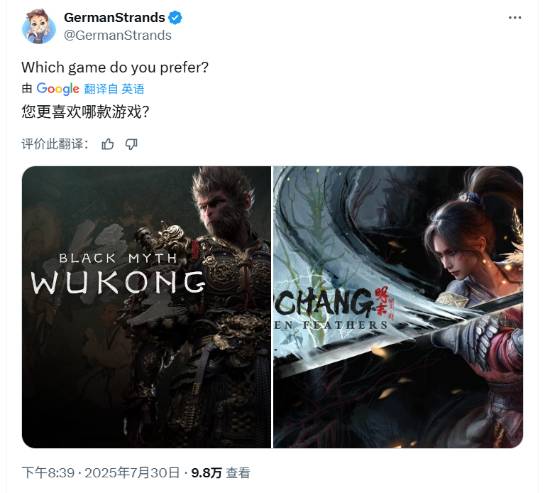 国产类魂大作《明末:渊虚之羽》于7月24日发售至今,已有一周的时间。日前,知名游戏推主germanstrands在推特上发布了发动态询问,《黑神话:悟空》和《明末:渊虚之羽》大家更喜欢哪款游戏,双方各有拥趸,阐述了自己喜爱的理由。