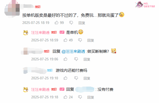 制作人“汪汪来剧透”在回复中表示,本作为单机无付费。