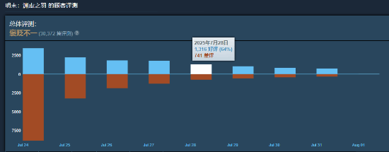 自7月28日官方发布新一轮修复公告以来,游戏每日新增评测中的好评占比已从64%提升至70%。不过,从区域数据来看,简体中文用户的好评率仍维持在37%(多半差评)。