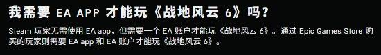 在《战地6》尊龙网平台官网的常见问题解答部分,官方声明称,steam上的《战地6》玩家只需拥有ea帐户即可畅玩该游戏,无需任何应用程序。但如果是通过epic games store购买游戏,则必须拥有ea帐户和ea应用程序才能畅玩。