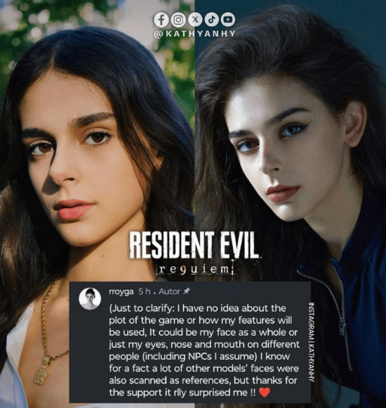 英国美女模特roya athina确认参与了《生化危机9:安魂曲》的面部捕捉工作,但她本人表示并不知道自己饰演的是哪一个角色,她在社媒写道:“澄清一下,其实我并不知道这款游戏的剧情,也不清楚我的面部特征会如何被使用。可能是整张脸被用上,也可能只是眼睛、鼻子或嘴巴被拼接到不同角色身上。我知道开发方确实扫描了很多模特的面部数据作为参考。不过还是非常感谢大家的支持,真的让我很惊喜。”