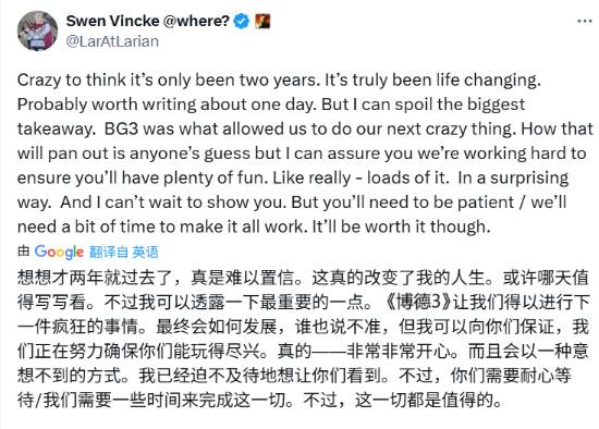 "想想才过去短短两年,真是不可思议。它彻底改变了我们的人生轨迹,或许某天真该好好写写这段经历。不过现在我可以先透露最重要的心得:《博德之门3》为我们实现下一个疯狂计划铺平了道路。最终结果如何尚未可知,但我保证团队正在全力以赴,定会为各位奉上惊喜连连的游戏体验——真的,超多那种。以意想不到的方式呈现。我已迫不及待想展示给你们看了,但还请保持耐心/我们需要些时间打磨完善。不过绝对值得等待。"