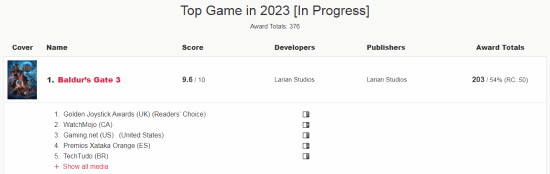 《博德之门3》在发售之后大获成功,据game of the year网站显示,《博德之门3》是2023年获奖最多的游戏,总奖项数达到了惊人的203个,其中包括tga年度游戏、金摇杆奖年度游戏、steam年度游戏等等,超多需要参加的奖项颁奖典礼甚至影响到了拉瑞安的开发工作。