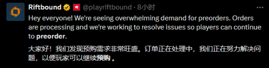 “我们对大家在距离英文版正式发售还有一段时间的情况下就展现出的支持和热情,深感谦卑,”拳头表示,“由于预购需求过于旺盛,我们的商城面临了极大的流量压力,导致不少用户在加载和结账过程中遇到了问题。我们团队正在积极寻求改进方案,努力让今后的预购体验更加顺畅。同时,我们也会持续关注《符文战场》的市场需求,并努力提升产量,确保玩家能够以合理方式购得产品。”