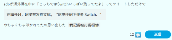 还有玩家以热门歌手ado的经历举例展示日本国内对ns2的疯狂追求:“我想起之前ado在海外的时候发了条推文,说‘这边还有很多switch剩着呢’,结果就因为这句话被疯狂骂了一顿。”