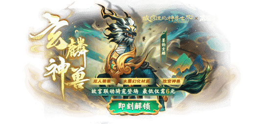 故宫里的神兽世界联动骑宠【墨韵玄麟】登场!灵感源自故宫壁画玄麟神兽,正式加入游戏!最低仅需6元即可解锁,双人骑乘、水墨幻化材质,彰显东方美学!