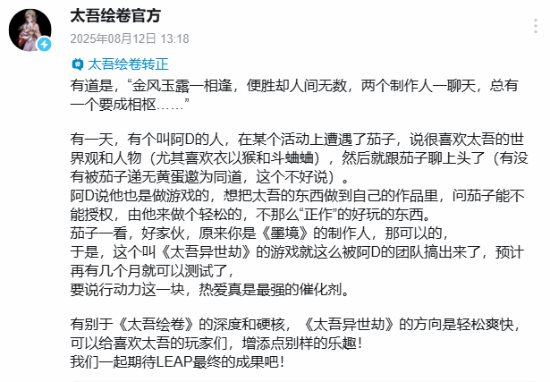据《太吾绘卷》官方介绍,本作来源于两位制作人的一次偶遇。