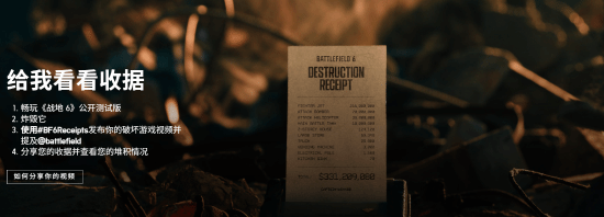 在公测开启时,《战地6》官方曾推出了一项活动:只要玩家在社交媒体分享自己的游戏录像并打上tag,官方就可以计算录像中玩家所造成的所有损失,包括破坏房屋、商店、卡车、直升机、战斗机甚至是自动售货机、电线杆等。