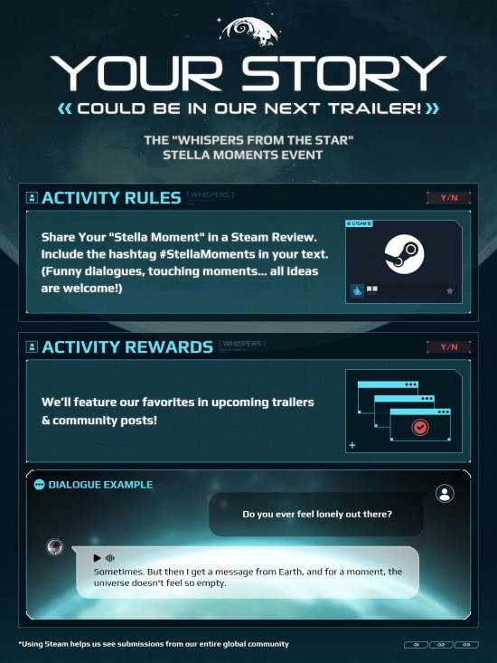 此外,官方发文表示,自游戏上线以来,收获了无数爆笑、感人至深、甚至有些奇葩的对话,于是决定开启一项特殊的活动,玩家只需在steam平台发布游玩的精彩瞬间,这些片段就有机会用于制作即将发布的官方预告片,并在社区亮点栏目中进行展示。活动持续至8月27日,被选中者官方将通过其steam评论下的回复直接联系