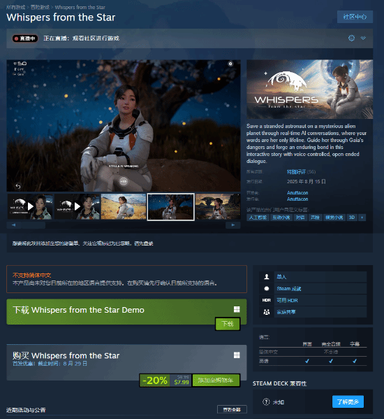 由anuttacon开发与发行的ai对话驱动开放叙事游戏《群星低语(whispers from the star)》于今日正式登陆steam游戏商城,售价9.99美元,首发前两周可享-20%优惠价7.99美元,不支持中文。