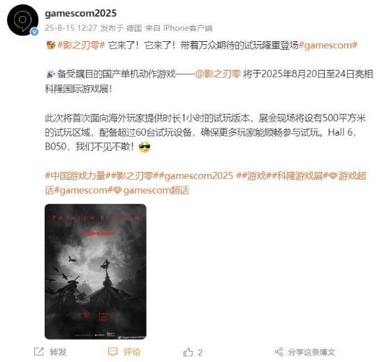 2025年科隆游戏展(gamescom 2025)将于8月20日至24日,在德国科隆如期举行。科隆展官方正式宣布,备受瞩目的国产3a武侠动作游戏《影之刃零》确认参展本次盛会。