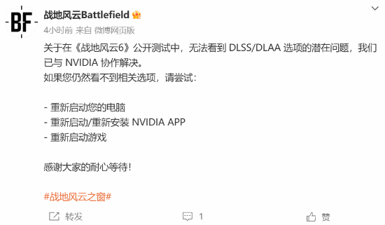 《战地风云》(battlefield)官方今日发文,宣布与nvidia合作,解决了在《战地风云6》公开测试中,部分玩家无法看到dlss/dlaa选项的潜在问题。