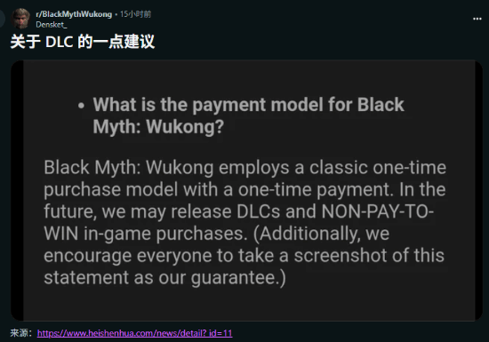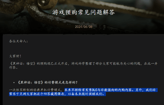 值得一提的是,早在去年《黑神话:悟空》发售前,官方在“预购常见问题解答”中就曾提到过:“未来不排除会推出dlc或非数值向的内购内容。另外,我们非常乐于见到大家把这个回答截图保存,以备未来随时提醒我们。”