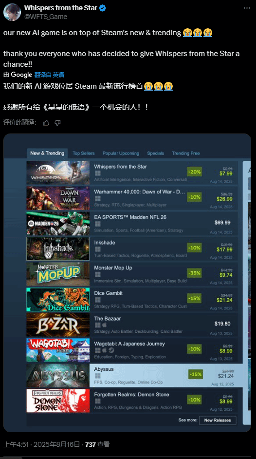 今日,该作的官方在推特发布致谢动态,宣布游戏位居steam“人气蹿升的新品”榜单之首。“感谢所有给《群星低语》一个机会的人!!”