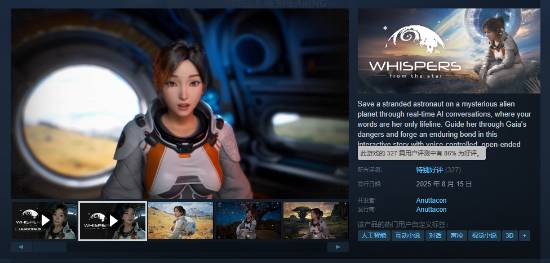 由米哈游创始人蔡浩宇创立的anuttacon公司所开发的《群星低语》(whispers from the star)日前正式发售,截止发稿,游戏在steam平台共收录327条玩家评测,好评率86%(特别好评)。