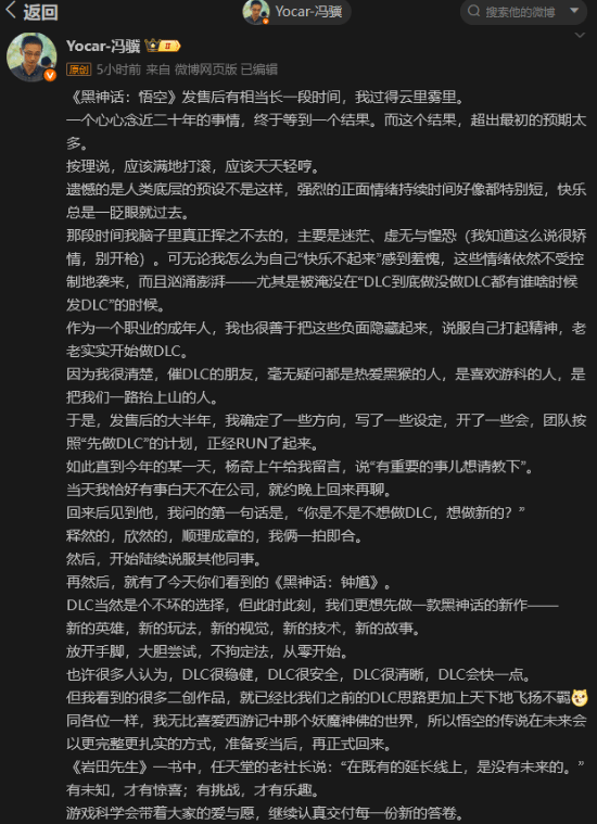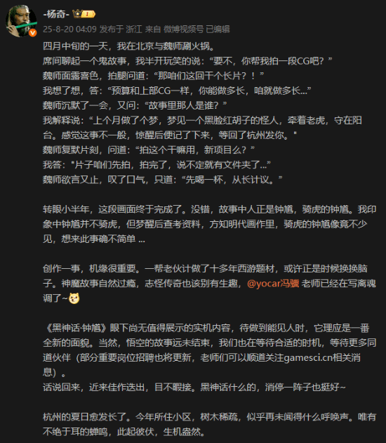 游戏科学的冯骥和杨奇也分别发文谈及了该支预告。
