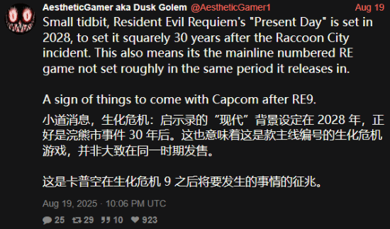 除此之外,aestheticgamer还说道:“《生化危机9:安魂曲》的当前时间线设定于2028年,恰好在浣熊市事件三十年后,这也意味着该作成为首部未采用近似发行年份作为背景的正传编号生化危机游戏,是卡普空在《生化危机9》之后时代布局的一个信号。”