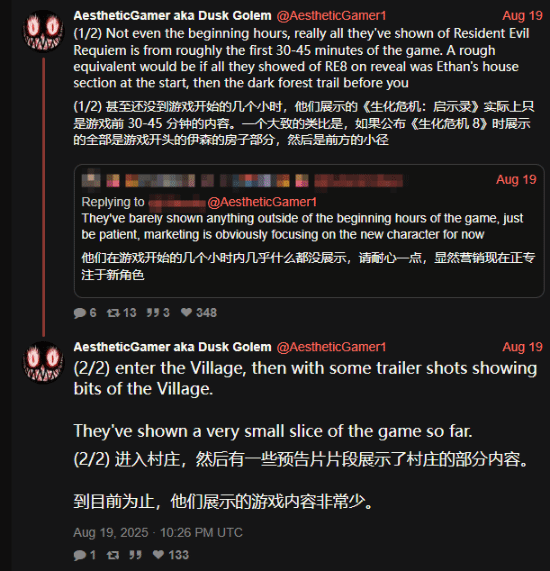 日前,知名《生化危机》消息人士aestheticgamer发文再次透露了一些《生化危机9:安魂曲》的新细节。aestheticgamer表示,当前展示的游戏片段实际上都集中在前30-45分钟。