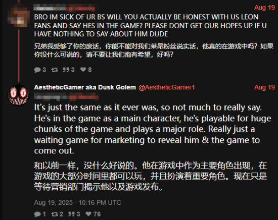 aestheticgamer还谈到了里昂:“一如既往,没什么好说的,他作为主角登场,在游戏中可操控的篇幅很大,并且扮演重要角色。”当然,一切信息应以卡普空官方发布的声明为准,上述信息均来自aestheticgamer个人的说法,还望各位玩家理性看待。