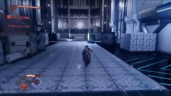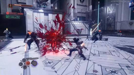 八云还能投掷炸弹将敌人轰至空中,衔接经典的"饭纲落"连招。源自《忍者龙剑传3》的空中断头投掷,将敌人相互撞击的招式也宣告回归。战斗间歇需滑行躲避激光陷阱、轨道滑行前进,并在神社执行多目标任务。演示中八云甚至启用翼装进行滑翔穿越。