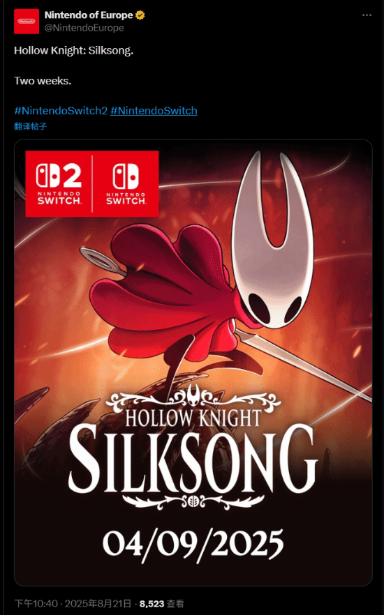 如今,这份漫长的等待终于迎来终点——《空洞骑士:丝之歌》正式宣布将于9月4日发售,为玩家们多年的期盼画上圆满句号。与此同时,任天堂官方也第一时间公布了这一消息,并特别提醒玩家:距离发售仅剩两周。