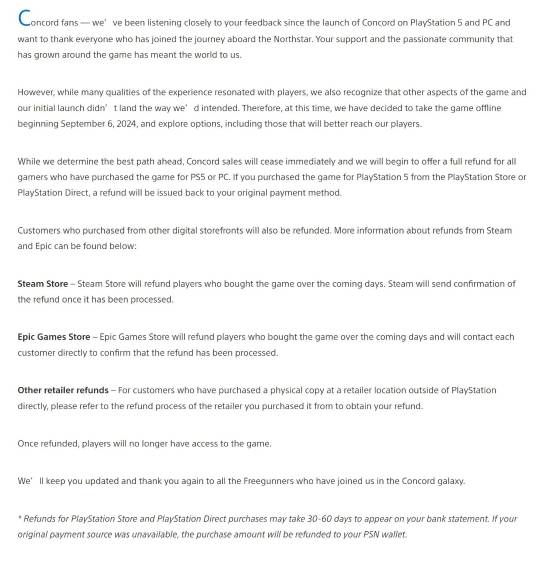 而后索尼playstation官方宣布,该作将在发售两周后的9月6日停服下线,所有购买游戏的玩家未来几天内都将获得全额退款。官方给出的理由是游戏上市后的表现未能达到预期,下线后游戏将会进行调整,以期重新归来。这也让这款游戏成为游戏工业史上一次令人扼腕的失败案例。