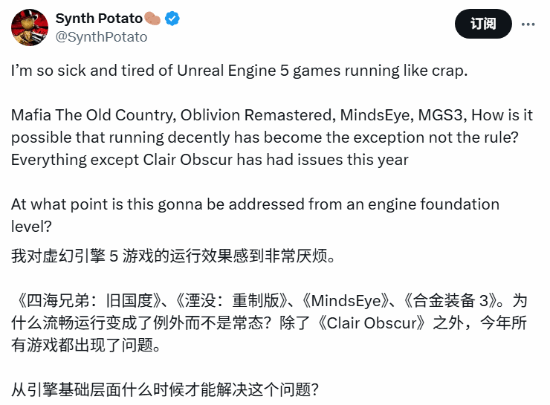 近日,知名游戏博主synthpotato发文怒喷虚幻5游戏——为什么能流畅运行反而成了例外而不是常态?