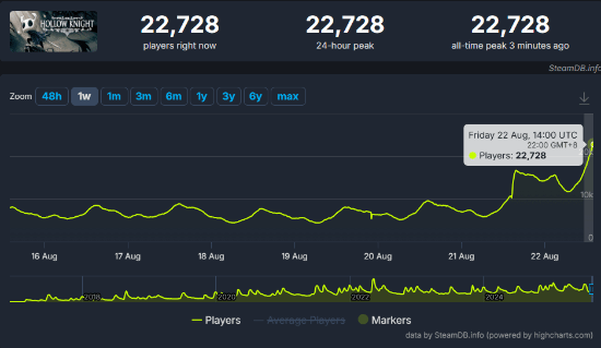 我们此前曾报道,《丝之歌》官宣定档的消息掀起了一阵《空洞骑士》的回归浪潮,这股浪潮也刷新了游戏历史最高同时在线人数的纪录。