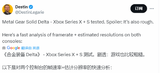 预购高级版《合金装备3:重制版》已经可以抢先体验游戏,近日,游戏频道destin分享了该作运行在xsx|s平台的性能表现。