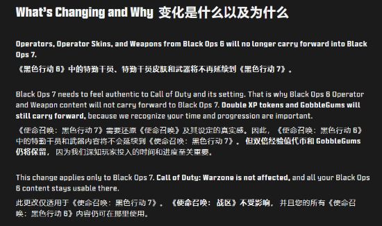 另外官方也指出,此项更改仅适用于《黑色行动7》,玩家在《使命召唤:战区》中的内容不受影响。