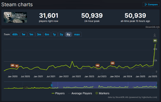 或许是受到了《空洞骑士:丝之歌》发售日的影响,截至发稿前,前作《空洞骑士》在steam平台的在线峰值已经突破了5万大关,达到了50939人,当前在线玩家数量为31601人。从图表里可以看到,自今年7月起,《空洞骑士》的玩家数量如同坐火箭一般快速上涨。