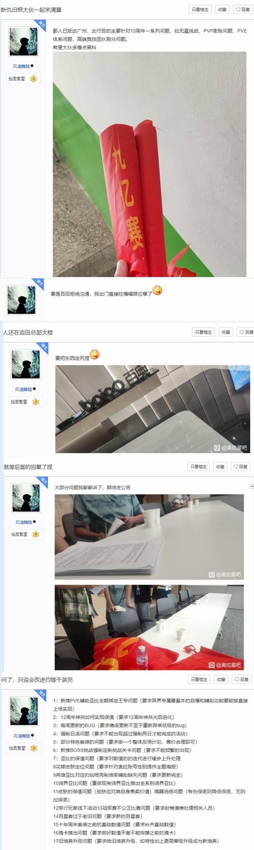 据悉,8月中旬,贴吧网友@风清舞随发帖称自己已抵达广州,此行目的是就游戏15周年相关问题进行当面沟通,包括“无冕挑战”、pvp数值膨胀、pve体系缺陷、高端竞技环境刷分等情况。他同时还在贴吧征集玩家意见,许多玩家也借此表达了对后期数值膨胀、产能不足、玩法单一以及“逼氪”操作的强烈不满。