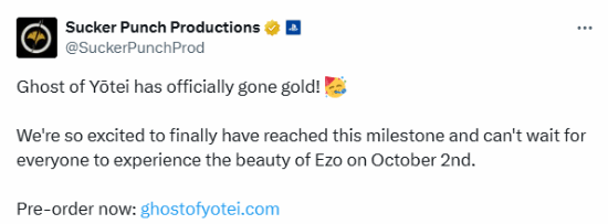 sucker punch今日宣布,《羊蹄山之魂》已经进厂压盘,官方表示:“迫不及待想让玩家们在10月2日体验虾夷之美。”