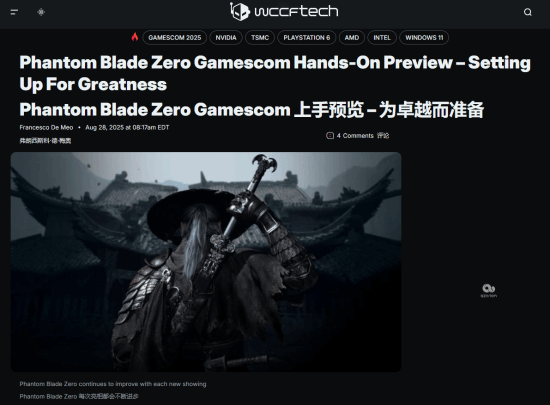 外媒wccftech近日参加了国产武侠动作游戏《影之刃零》的试玩活动,于今日发布了试玩报告,并称其卓越、伟大(greatness)。本文简要翻译整理如下: