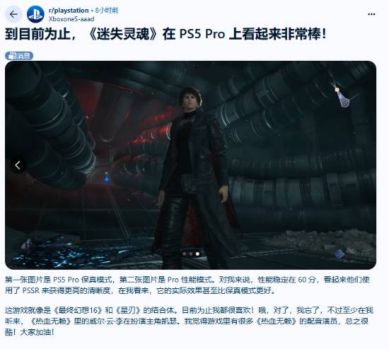 在reddit论坛上,id为“xboxones-aaad”的玩家便发表了自己的看法。他展示了在ps5 pro画质模式以及性能模式下的实机画面表面,举起表述,该作能在性能模式下帧率稳定保持在60帧,开发团队似乎运用了pssr技术提升画面精密度——在实际动态演示中,其清晰度甚至超越了画质模式。