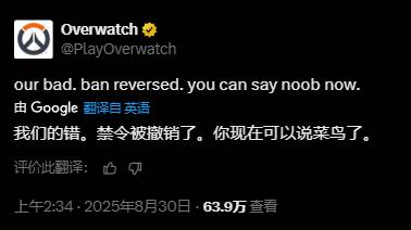 今日,《守望先锋》官方在推特发文致歉,表示已经撤销了该封禁“我们的错。封禁被撤销了。你现在可以说‘菜鸟’了。