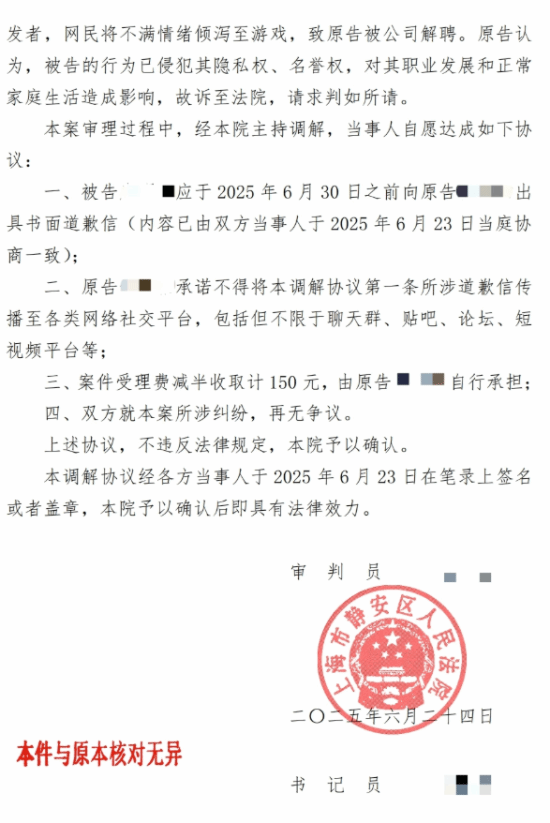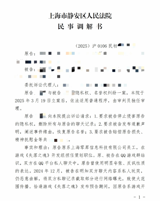 2024年12月份事发后,本人并遵循前司决策不在任何相关平台发声。同时,考虑到蓝某某尚在读书,我也并不想以暴制暴,引发二次舆论,还是要通过正规合法的途径解决这个问题。因流程问题,直到近期才拿到法院的相关文书。为了将此次事件对项目影响降到最低,我也选择在发售后出来澄清。后附相关文书(相关隐私已将其身份信息做脱敏处理)。