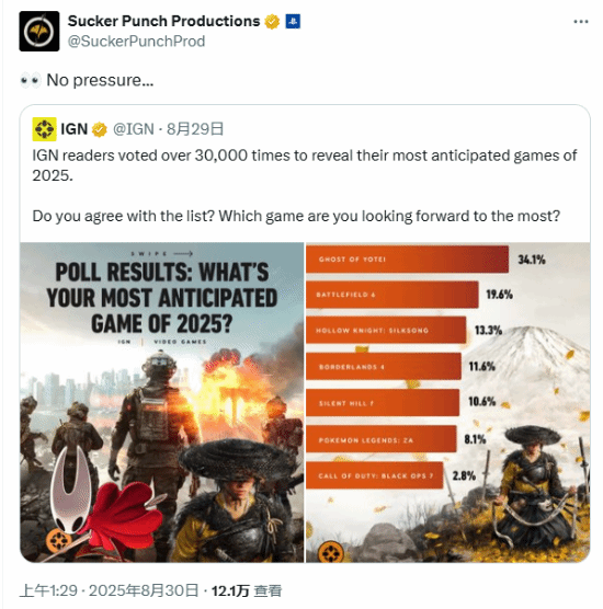 8月30日,《羊蹄山之魂》开发商sucker punch转发了这份榜单,说道:“没有压力!”值得一提的是,《羊蹄山之魂》现已进厂压盘,饰演《羊蹄山之魂》主角“笃”的演员erika ishii转发了这则压盘的好消息。屏幕前的你是否期待《羊蹄山之魂》?一起在评论区聊聊吧!