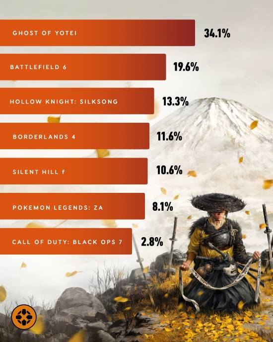 8月29日,ign官方发布了一份榜单,展示了由玩家选出的2025年最期待游戏,在榜单里可以看到,《羊蹄山之魂》以34.1%的投票率遥遥领先,紧随其后的分别是《战地6》《空洞骑士:丝之歌》《无主之地4》以及《寂静岭f》等游戏。