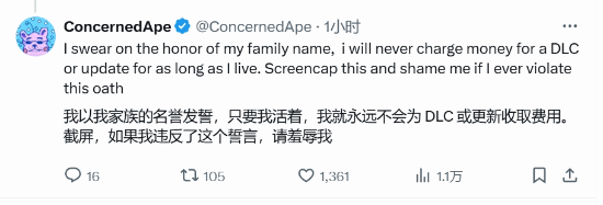 而上个月concernedape发推文表示,1.6的主机端移植工作以及pc端的1.6.9版本更新正在进行中。concernedape向玩家们保证,一旦有任何新进展,都将及时告知大家。他还在评论区进一步承诺,未来的所有更新和dlc都将永久免费,以回馈玩家们的支持。