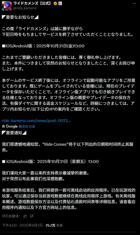 今日,《假面骑士》系列女性向手游《ride kamens》官方发文宣布,该作将于10月31日停止服务,并计划在停服后推出离线版。
