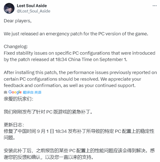 今日,国产动作游戏《失落之魂》官方推特宣布为游戏的pc版本发布了紧急补丁。