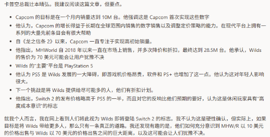 另外,卡普空表示ps5主机成本提高后,玩家购买《怪猎荒野》的门槛也变高了。加上会员费用,年轻玩家们可能难以承担。这也让网友们认为辻本春弘是在转移《怪猎荒野》后续销量乏力的原因,将内容更新和运营不足的锅甩给ps5。