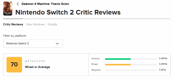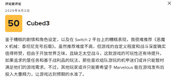 而仅给出50分的cubed3则表示,《机甲战魔 神话之裔》实在不是一款值得推荐的作品。游戏的剧情与角色塑造都很糟糕,在switch2平台上的性能表现也令人失望。当然,其丰富的机甲自定义系统以及颇具深度的战斗系统值得称赞,但开放世界内容过于单调乏味,并缺乏太空战斗内容。“痴迷机甲的玩家们如果能找到朋友组队游玩,或许能通过任务驱动和战利品收集获得短暂乐趣。而对于其他玩家来说,只能期待制作组的后续更新了。”