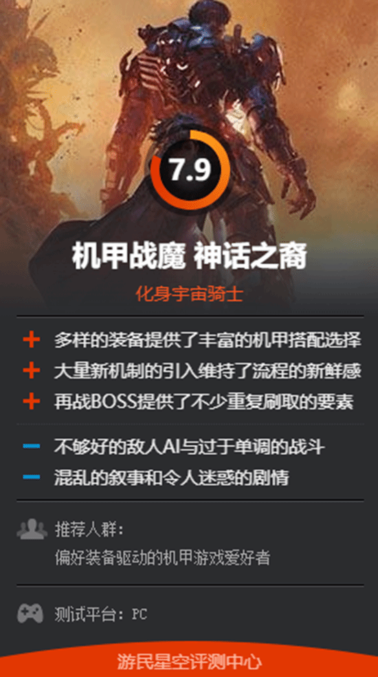 值得一提的是,我站给予了《机甲战魔 神话之裔》7.9分的评价,认为本作是一部能够用满溢而出的机甲气息给人带来突出吸引力的作品,优点和缺点都同样突出。虽说它的剧情有些令人迷惑,战斗部分也显得有些单调,但多人联机刷取的过程,又适度弥补了这方面的不足。详情请移步>>>《机甲战魔 神话之裔》评测7.9分 化身宇宙骑士