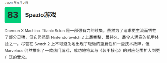 给出了83分的spaziogames认为,《机甲战魔 神话之裔》是一款出色的续作。虽然为迎合主流市场牺牲了部分核心特色,但本作仍能称作switch2平台上最完善、最耐玩、最令人满意的机甲游戏。marvelous交出了一份出色的答卷,成功吸引了更加广泛的玩家群体。不过本作不可避免地出现了轻微的内容重复问题,以及在switch 2平台上的一些技术故障。