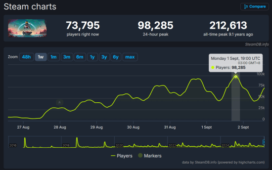 截至发稿前,根据steamdb数据显示,steam24小时玩家最高在线峰值已经达到了近六年来的新高——98285人。
