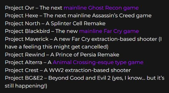 原定2025年底发布的《刺客信条4:黑旗》重制版(代号obsidian)与多人游戏(代号invictus)现已延期。2027年后计划包括《全境封锁3》《飙酷车神》及多款《刺客信条》衍生作品。